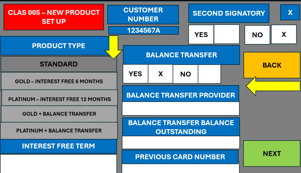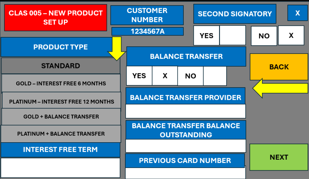 The next thing to consider is if a Balance Transfer was relevant. This will be detailed in the Credit Card Application System. This is detailed in the system in CLAS005 New Product Set Up and was added on the customers initial application. In this example a Balance Transfer is applicable.