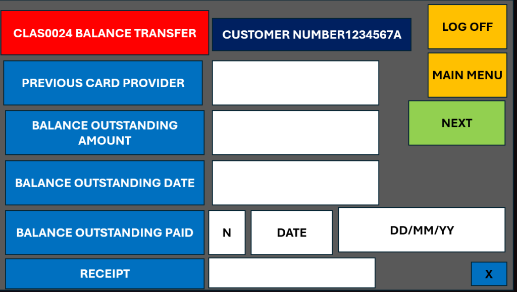 The user will then add details of the balance transfer paid, which is on screen CLAS0024.