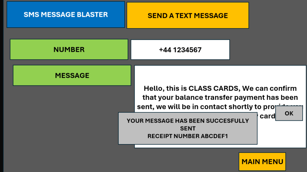 A SMS will be issued to the customer to confirm that the application has been received and balance transfer paid if applicable. This requires process logic to check if there is a balance transfer and the SMS message will be issued accordingly. The SMS message system will be used for this.