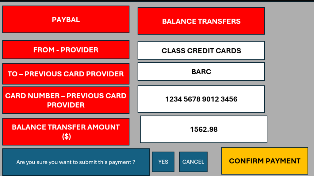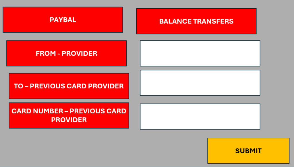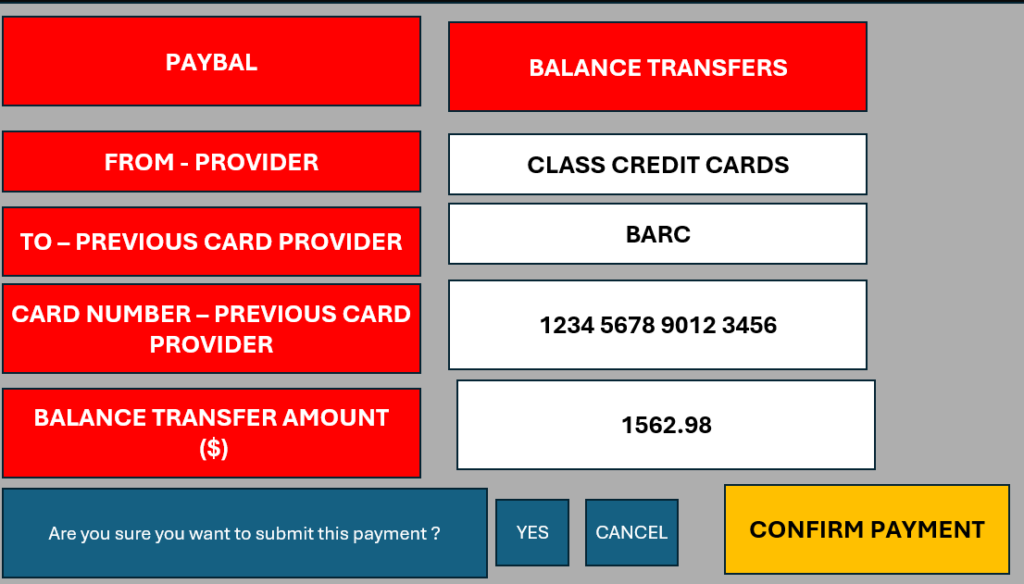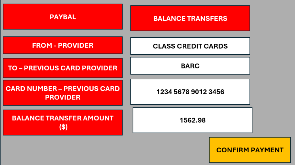 In this example, the balance transfer details haven’t been completed but assuming they had, the user would transfer this information to the payment system.