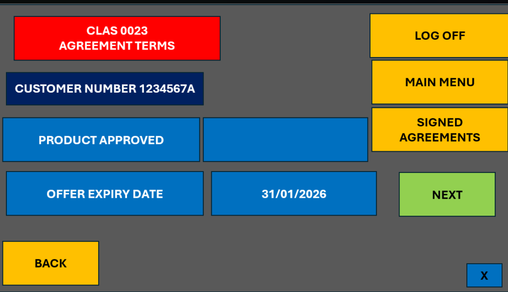 The user then checks the date of agreement is before the expiry date detailed in the system, to ensure the offer hasn’t expired. This is on screen CLAS0022 so the user has to click next on CLAS0020 and again on CLAS0021 to get to this screen.